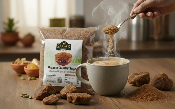 Organic Country Sugar (Naatu Sakkarai) is a traditional Indian sweetener made using age-old methods from natural palm and coconut extracts, without any chemicals, artificial colors, or preservatives.